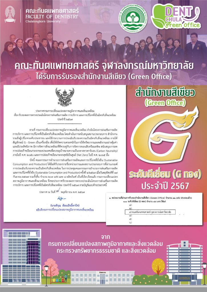 คณะทันตแพทยศาสตร์ จุฬาฯ ได้รับรางวัลสำนักงานสีเขียว ระดับดีเยี่ยม (G ทอง) ประจำปี 2567
